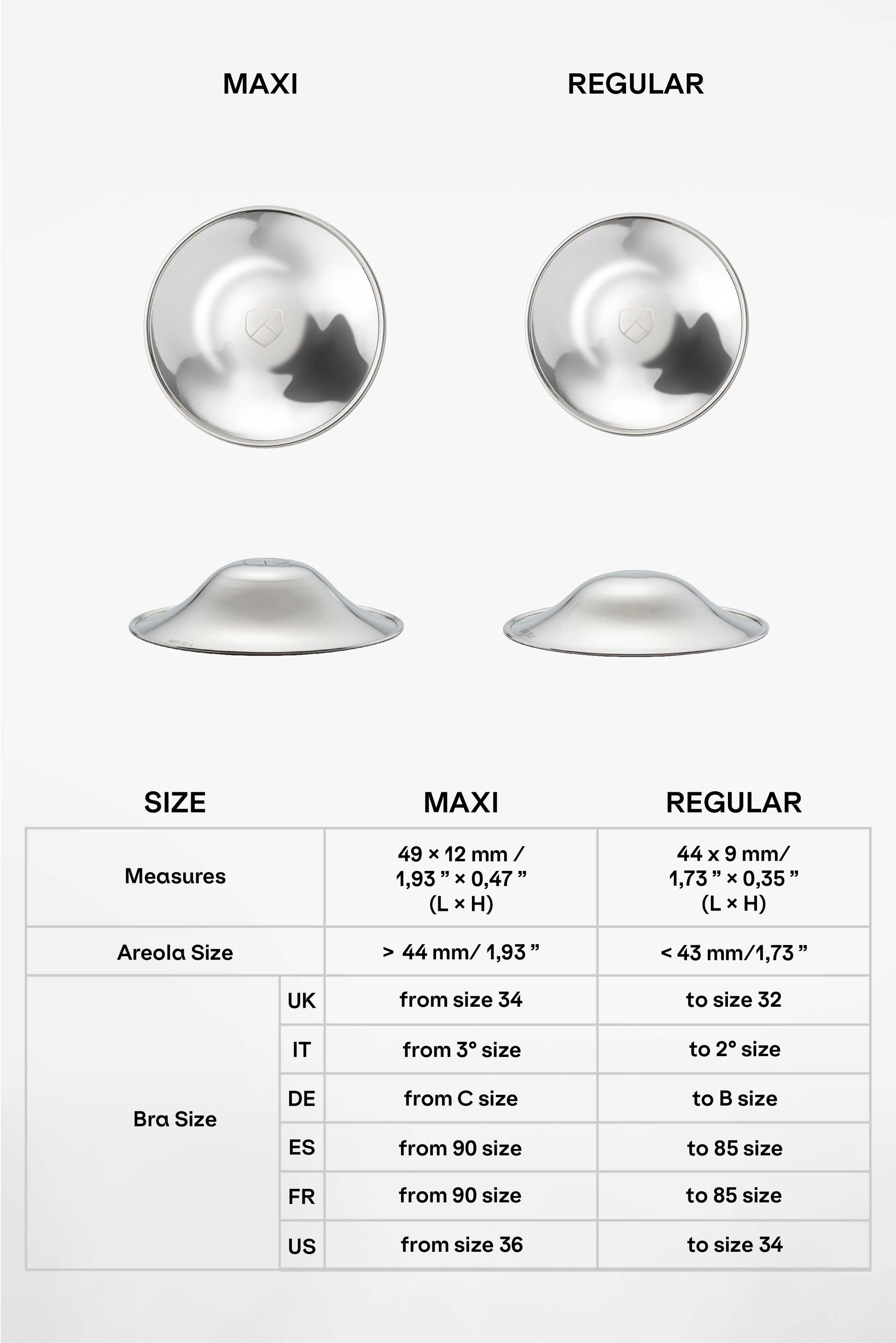 Koala Silver Cups are available in two different sizes: Regular Product dimensions: 43x6,5 mm (LxH) Areola size: < 43 mm Bra size: up to 34 (UK) Maxi Product dimensions: 44x12 mm (LxH) Areola size: > 44 mm Bra size: from 36 (UK)