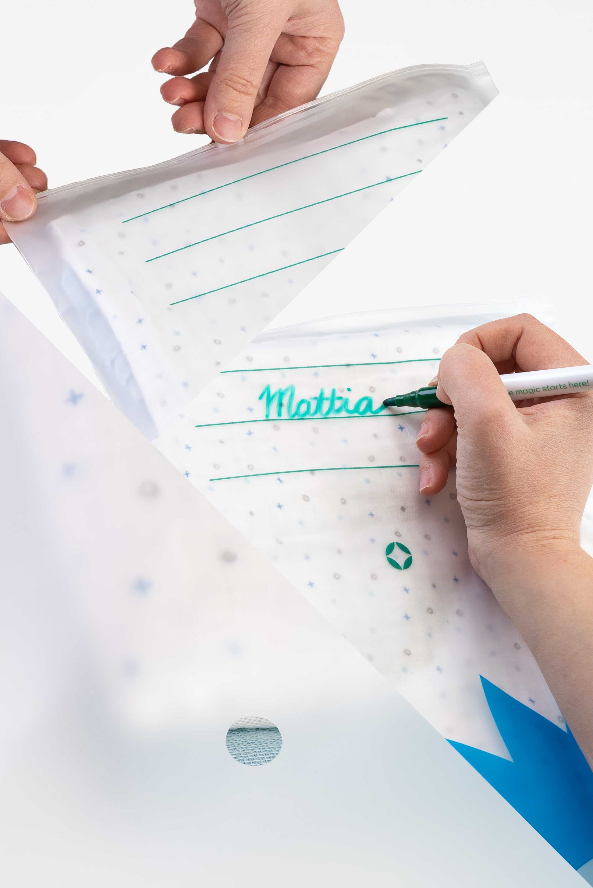 12 bolsas transparentes para el cambio del bebé encontraras rápidamente todo lo necesario los primeros días, sobre todo en el hospital. Personalízalas con tu nombre y reutilízalas en el futuro para la escuela infantil.