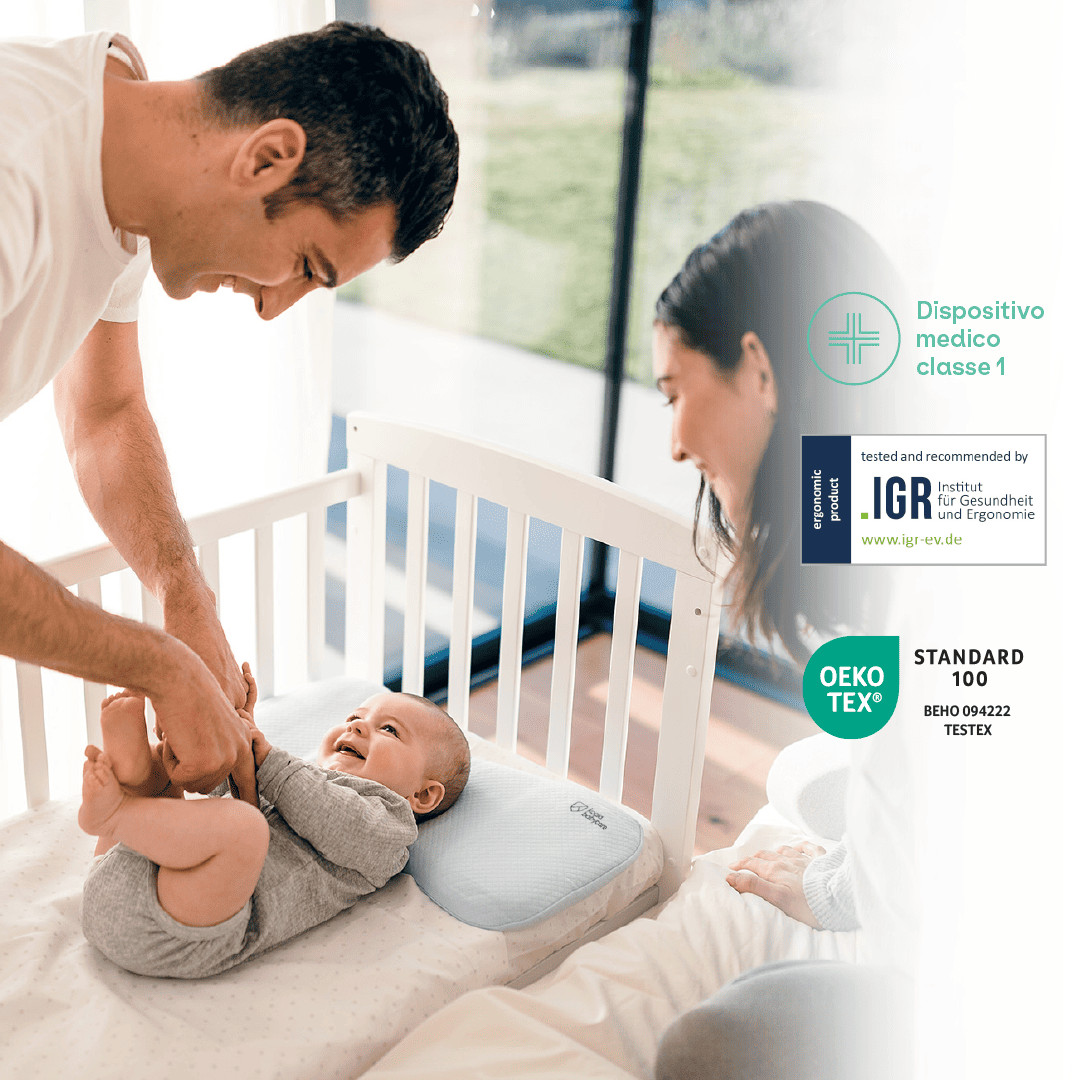 Made from German memory foam, it distributes pressure evenly across the skull area and, thanks to its slim design, guarantees correct neck and back posture, helping to keep a baby’s airways open at all times.